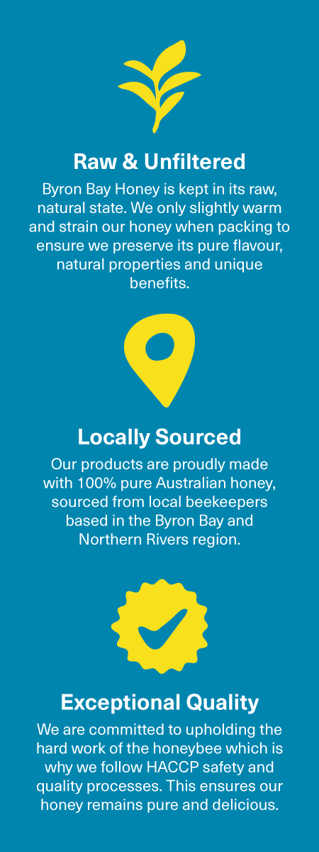 At Byron Bay Honey, we have a deep appreciation for the origins of honey and the hard work of bees. We treat this natural product with the utmost respect and care, ensuring that everything that bears the Byron Bay Honey name is 100% pure, raw, and authentic.